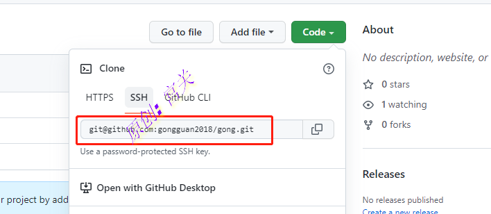 - git@github.com:gongguan2018/gong.git:通过ssh方式连接仓库,此地址在git仓库位置可以看到