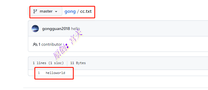 进入仓库本地仓库gongguan ,查看master分支下的gong.txt文件( gong.txt是已经存在master分支下的文件并且已经提交到仓库的 )