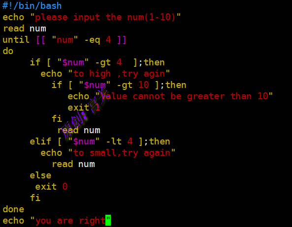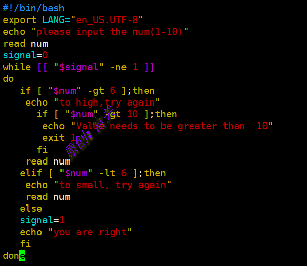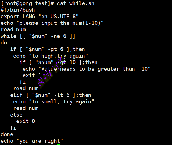 使用结束标记控制的while循环实现猜测1-10之间的数,通过read读取输入数字,中间又加了一个判断,如果大于10则报错并退出,如图: