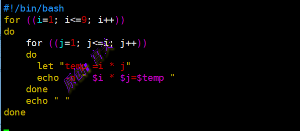 使用两个for循环嵌套实现九九乘法表,最后的echo “”表示换行输出,如图:
