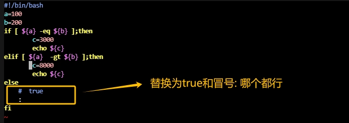 此时,如果我们不想让else中的内容执行,要else,但是什么也不执行,此时可以将内容替换为true或者冒号来占位,如图: