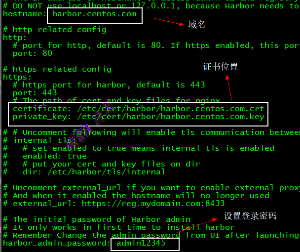 1、自己设置的域名和证书的名字要匹配,例如证书名字为harbor.centos.com.crt,那么设置域名也要设置为harbor.centos.com,证书名和域名都可以自定义,只要匹配即可