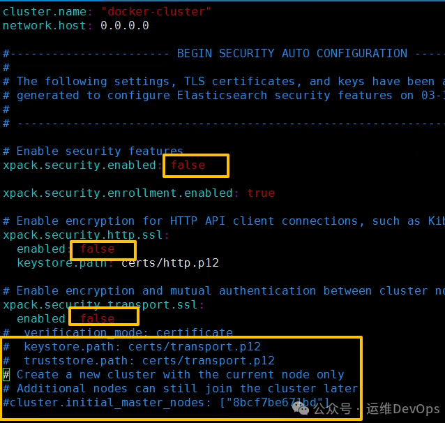 3、vim config/elasticsearch.yml 文件,修改安全认证为false,注释掉ssl相关配置和cluster.initial_master_nodes(如果不注释就要配置证书否则报错),如图: