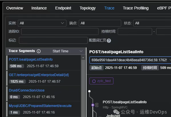 - OAP(Observability Analysis Platform):流式分析 Agent 上报的 Trace & Metric,数据写入 ES/MySQL/TiDB等存储中