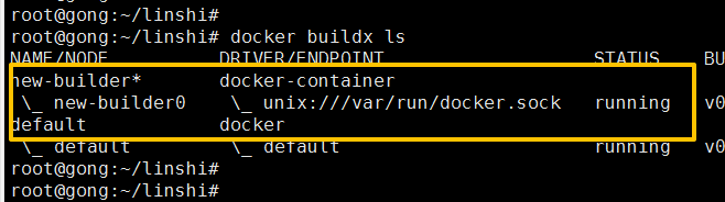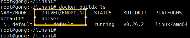 buildx安装完成后,此时使用buildx构建的镜像还是基于docker驱动,如图: