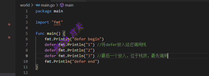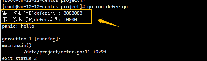 从上图可以看出,代码的延迟顺序与最终的执行顺序是反向的,延迟调用是在defer 所在函数结束时进行,函数结束可以是正常返回时,也可以是发生宿机时。