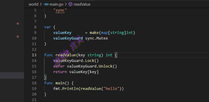 - 第15行:使用defer 语句添加互斥量解锁,该语句不会马上执行,而是等readValue()返回时才会被执行