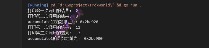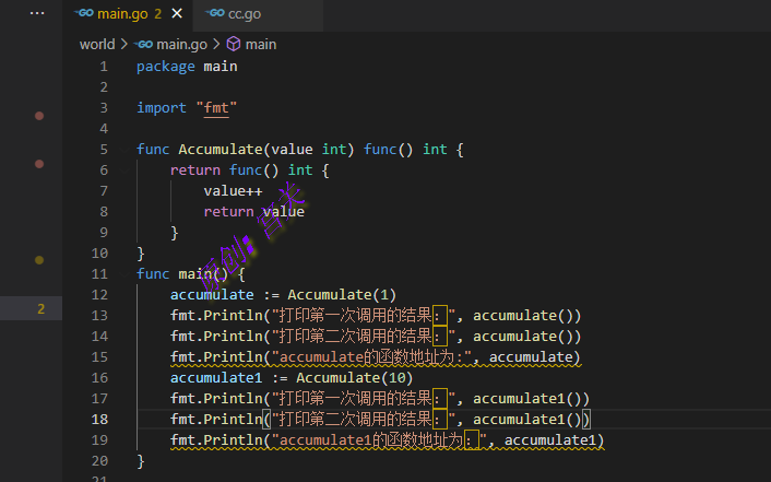 - 第12行:创建一个累加器,初始值为1,返回的accumulate是类型为func()int的函数变量