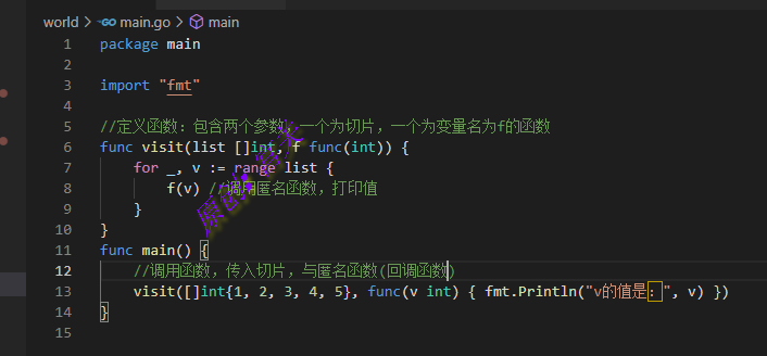 下面的代码实现对切片的遍历操作,遍历中访问每个元素的操作使用匿名函数来实现。用户传入不同的匿名函数体可以实现对元素不同的遍历操作,如图: