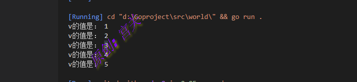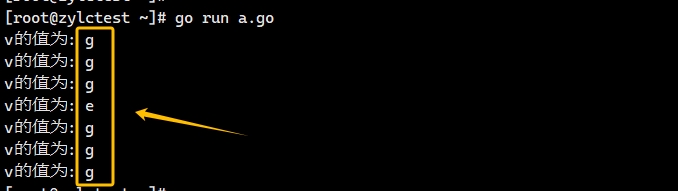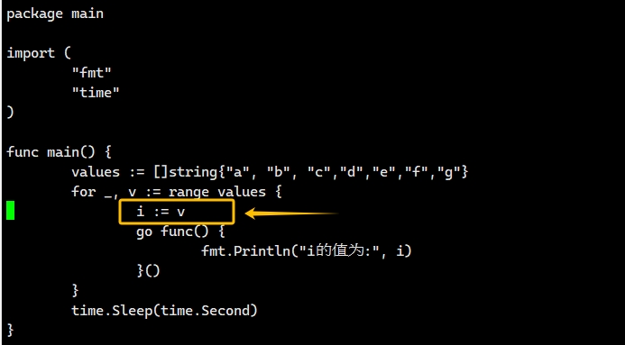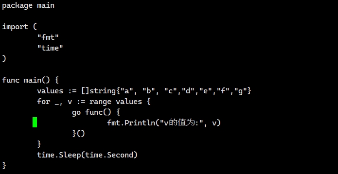 从上图看出,结果不及预期,因为main所在的goroutinue和go func()的goroutinue两个是无序进行的,当执行闭包函数的时候,v的值可能已经是最后一个,也可能是随机,因此闭包函数可能每次获取的都是同一个v的值,要想解决此问题,只需要将循环变量的值赋值给一个新的值,每次循环都会创建一个新的值,如图:
