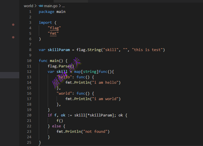 - 第11行,flag的包的固定语法,解析命令行参数,解析完成后,skillParam指针变量将指向命令行传入的值