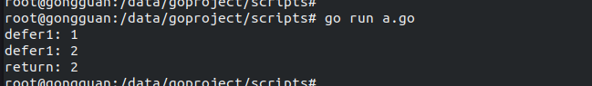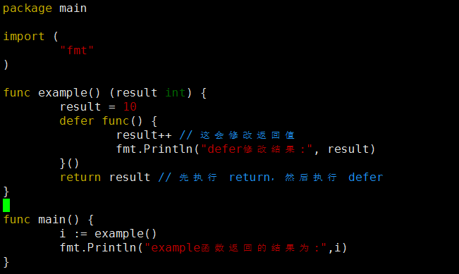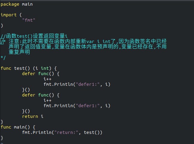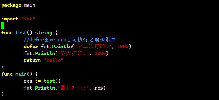 注意:defer是在return语句执行完成后并且在函数真正返回给调用方前执行,因此先打印defer,然后打印return返回内容