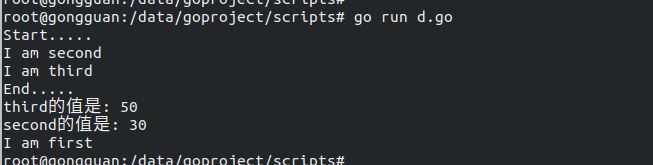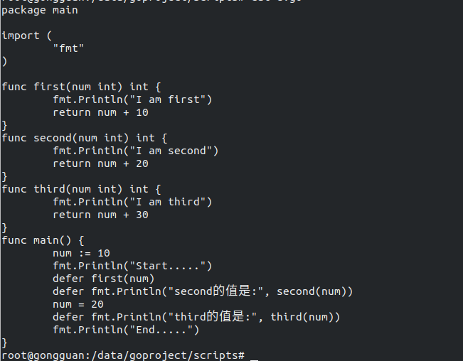 上图中的三个延迟函数,一个first(),还有两个Println(),都有参数,但是第一个参数num就是一个变量,单独的变量不能执行任何计算,后面的两个fmt.Println()中的参数second和third可进行计算,因此先执行second然后执行third,在执行完End后,开始倒着来打印defer的函数,third这里打印的是third函数的return,second打印的是second函数的return,first因为只传递了num参数,因此,只打印first中的fmt,不打印return,如果将defer first(num)改为defer fmt.Println(first(num))就会打印return的值了,如图: