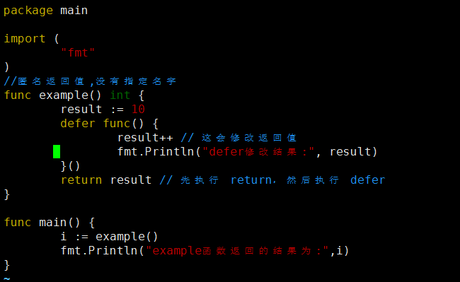 上图中的结果返回11而不是10 ,是因为Go 语言的 ”命名返回值 + defer 修改” 机制在起作用,命名返回值的意思就是在函数的返回值位置也指定了名字(上图中的result int),return result实际是将result放入返回栈中,如果是命名返回值,那么此时栈内为result的引用,defer仍然可以修改此引用的值,修改后最后一起返回