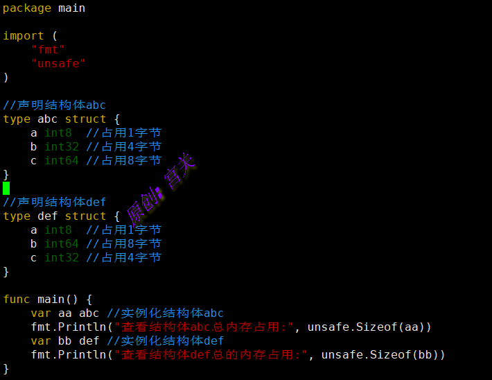 1、字段顺序不同,所占用内存空间大小不同,通过unsafe.Sizeof方法可以获取内存大小,如图: