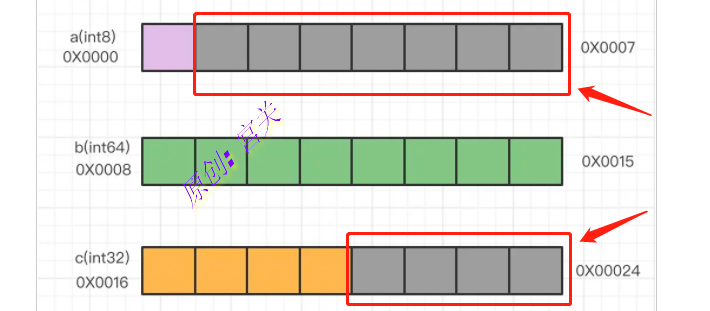 从上图看出,a占用1个字节,b占用8个字节,但是第一列已经满了,因此会有一个字节的数据排列到第二列中,如果要获取b字段的数据,CPU需要读取两次才能获取到完整的b数据,此时影响了程序的性能,为了减少CPU获取的时间,Go编译器会把结构体做数据对齐,如图: