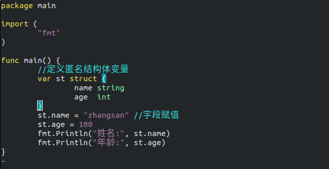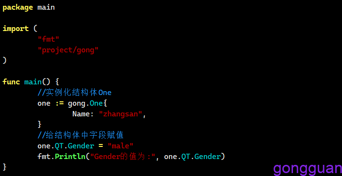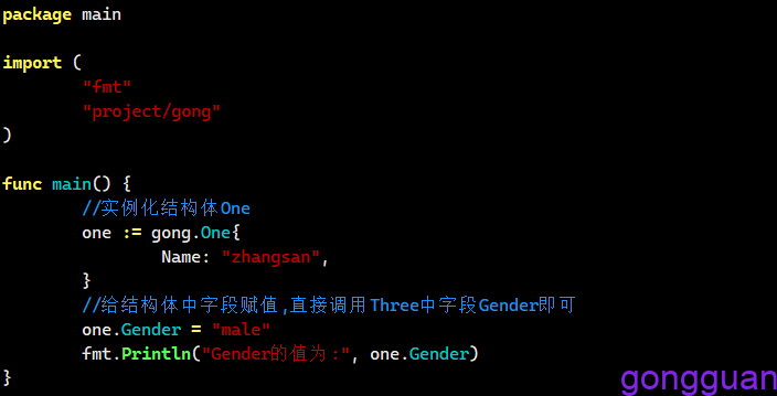 下面的例子表示创建了结构体并实例化后,通过”点表示法”给字段赋值,如图:
