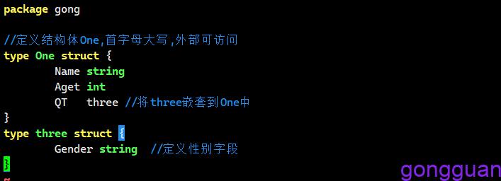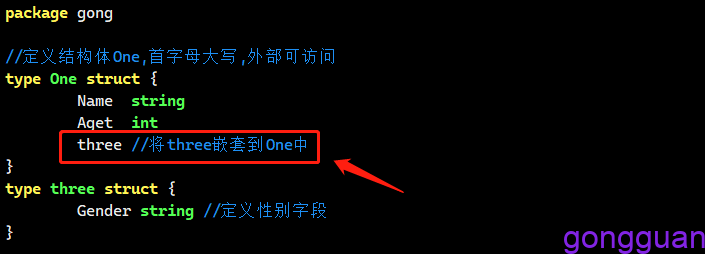 结构体内嵌初始化时,将结构体内嵌的类型作为字段名像普通结构体一样进行初始化,如图: