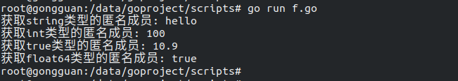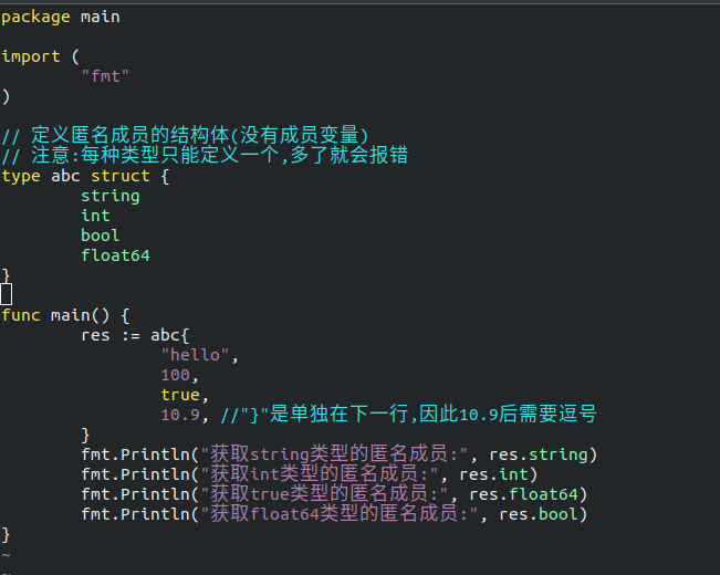 - 定义结构体中的匿名字段,类型分别是整型、浮点、布尔。
