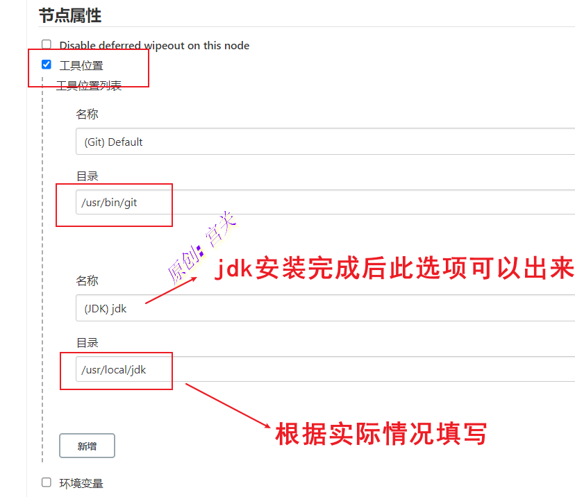 点击左侧的系统管理–全局工具配置,点击新增JDK,根据实际情况填写jdk位置(不建议自动安装与yum安装),如图: