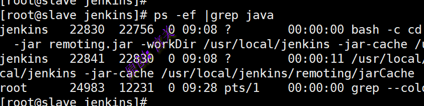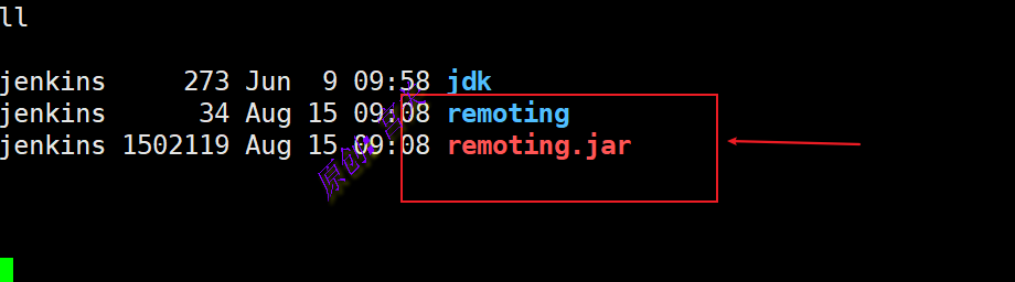 5、启动成功后,master节点会将remoting.jar文件拷贝到/usr/loca/jenkins目录下,并启动,如图: