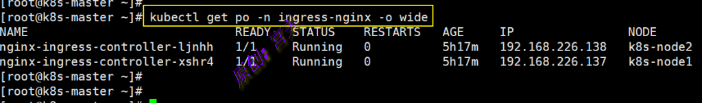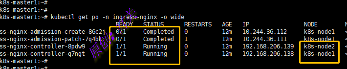 执行kubectl apply -f deploy.yaml创建pod,执行kubectl get po -n ingress-nginx -o wide查看创建的pod,如图: