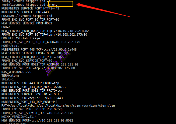 创建一个新的Pod并进入pod内部(客户端),可以看到系统自动设置的环境变量信息,如图: