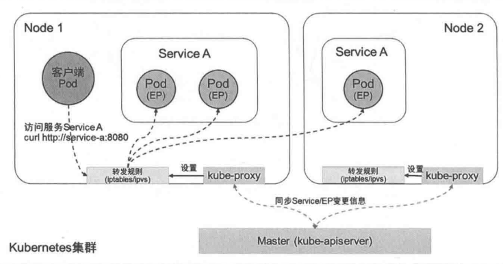 当一个Service对象在Kubernetes集群中被定义出来时,集群内的客户端应用就可以通过服务IP访问到具体的Pod容器提供的服务了。从服务IP到后端Pod的负载均衡机制,则是由每个Node上的kube-proxy负责实现的(iptables/ipvs规则),如图: