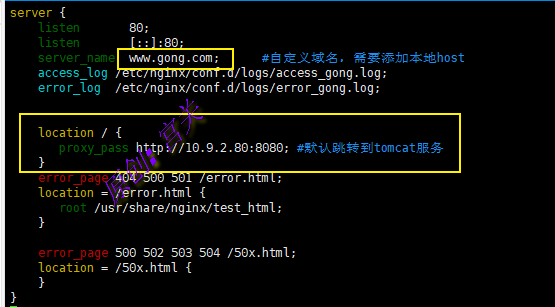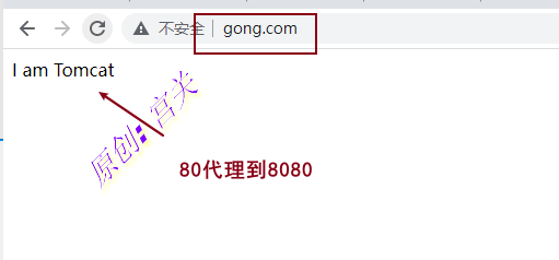 说明:www.gong.com为自定义域名,需要在windows本地添加解析,通过此域名的80端口访问将代理到10.9.2.80的8080端口,也就是tomcat服务上