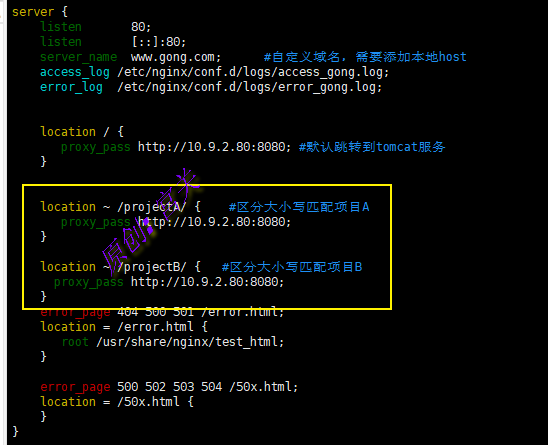 编辑gong.com.conf文件,配置不同的url条件,如图: