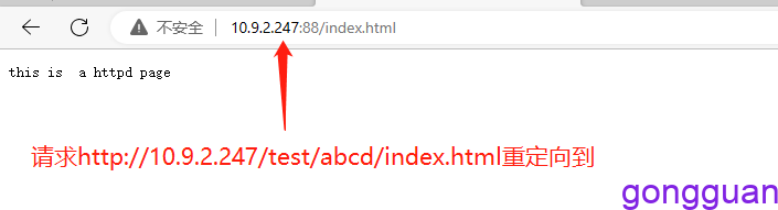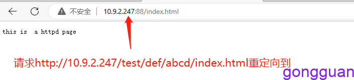 浏览器中输入http://10.9.2.247/test/abcd/index.html,实际重定向的路径是http://10.9.2.247:88/index.html,因为$1匹配的只是()中的内容