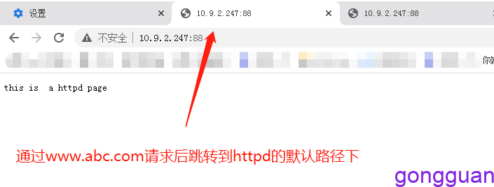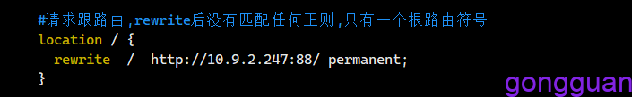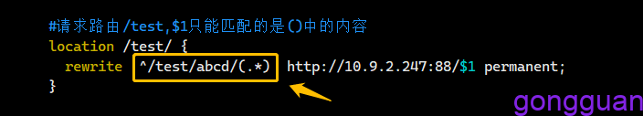 上图中的rewrite有两个括号内容,那么将分别对应$1和$2,因此实际请求将匹配到http://10.9.2.247:88/abc/abc.html
