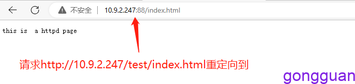 此时通过浏览器请求http://10.9.2.247/test/index.html,将跳转到httpd默认路径下的index.html,因为$1只能匹配括号的内容,此时(.*)匹配的内容就是index.html,因此实际重定向的路径就是http://10.9.2.247:88/index.html,^/test表示匹配以test开头的路由,location中是test,这里匹配的开头也要是test,不能所以写,会报错