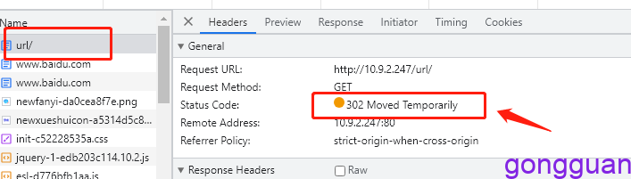 此时通过浏览器访问http://10.9.2.247/url/ 将重定向到百度页面,查看返回状态码,如图: