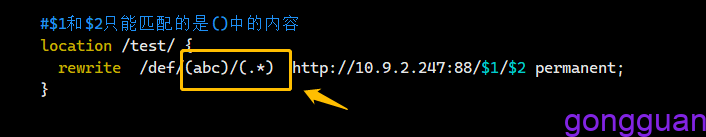 rewrite /(abc)/(def) https://example.com/$1/$2 #匹配路径为https://example.com/abc/def