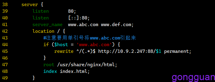 - 44行:如果请求域名为www.abc.com,那么将通过rewrite重定向否则直接请求nginx的根路径文件