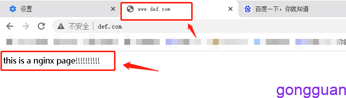 通过浏览器访问www.def.com,可以看到跳转到了Nginx的默认界面,如图: