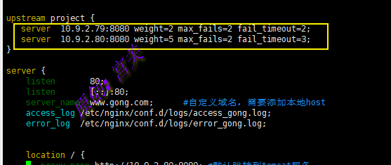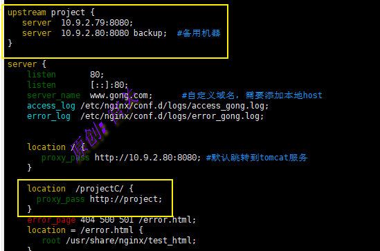 如果被代理的服务器有两台, 当一台服务器发生故障时,才启用第二台服务器提供服务,配置如下:
