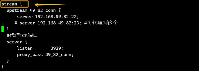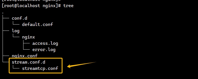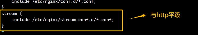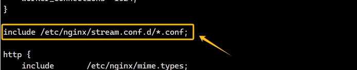 注意:上图中的stream还有一种写法,就是在streamtcp.conf中用stream模块包裹,然后nginx.conf中直接使用include引入,如图: