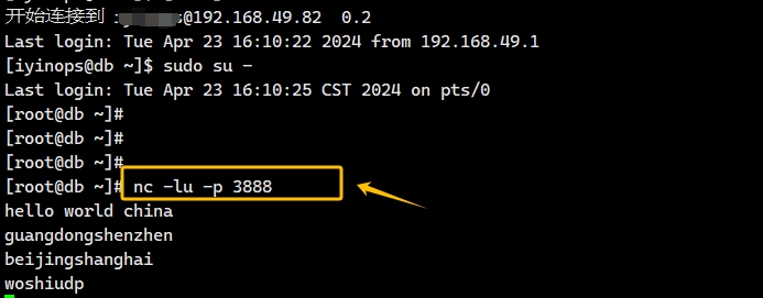 2、在Linux命令行验证UDP数据,首先单独找一台机器,通过nc命令,向192.168.49.83的3999端口发送数据,然后在49.82机器通过命令接收UDP数据,如图: