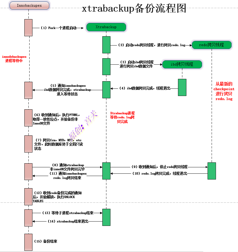 (1)innobackupex启动后,会先fork一个进程,用于启动xtrabackup,然后等待xtrabackup备份ibd数据文件;