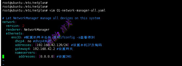 1、查找/etc/netplan下的默认网卡配置文件,名称为:01-network-manager-all.yaml,如果没有可以新建(权限要是600才可以),编辑内容如图: