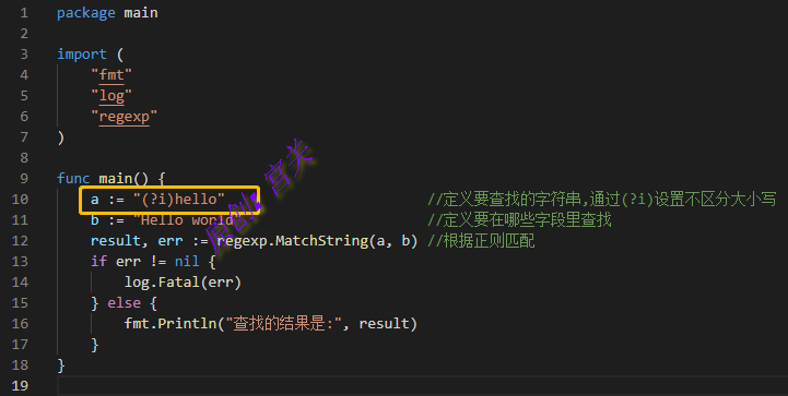 从结果中可以看出,并没有找到符合的字符串,因为正则匹配是区分大小写的,要查找的为小写的hello,在变量b中没有匹配的字段