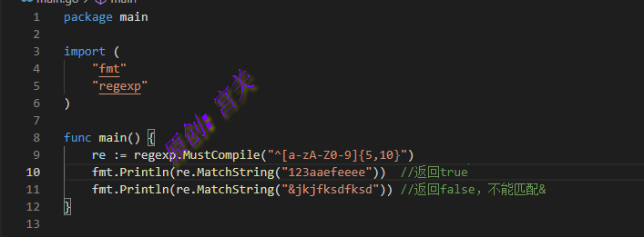 - 第15-16行:MustCompile用来解析一个正则表达式是否合法,如果不合法抛出异常,合法则返回Regexp 对象