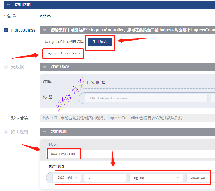 配置ingress路由:(本例子中ingress为单独安装,并未通过kuboard安装)