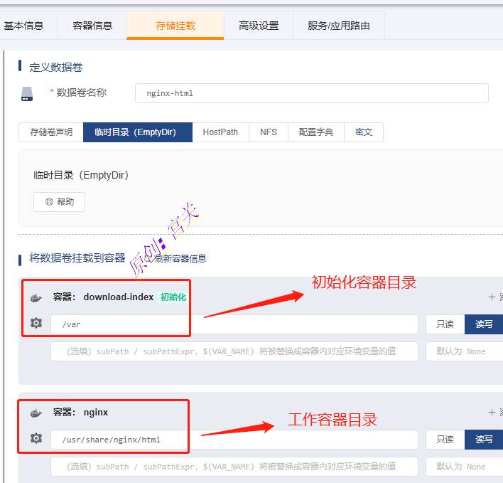 上方例子中的初始化容器中下载的index.html是在busybox容器内部的/var目录,而工作容器nginx的页面目录在nginx容器的/usr/share/nginx/html目录,无法直接使用busybox内部的/var目录,因此需要通过EmptyDir】挂载卷形式来实现共享,如图:
