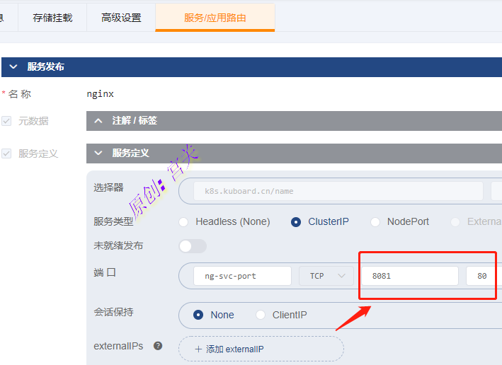 在服务页面,配置service端口与targetPort端口,选择器为根据标签选择后端pod,如图: