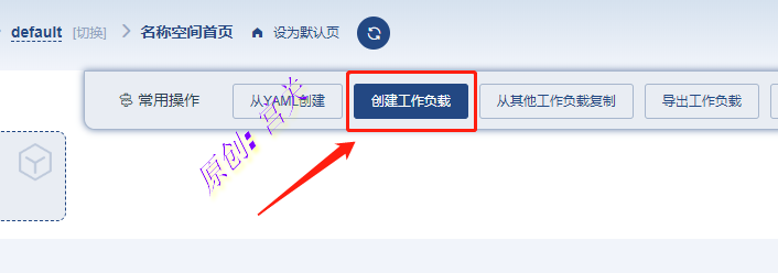 1、首先选择要操作的命名空间,本例子以default命名空间为例,并点击创建工作负载,如图: