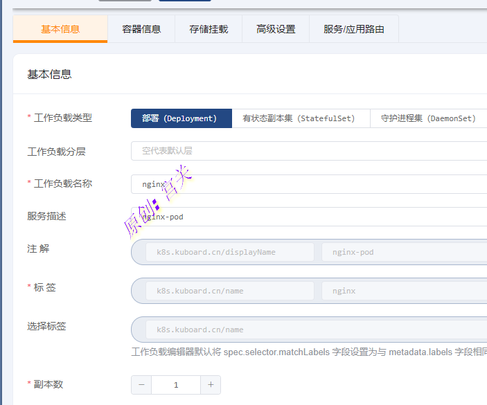 选择控制器类型,本例子选择deployment,输入展现的pod的名称,自定义服务描述,注解和标签可自动匹配,也可以手动指定新的,最后设置副本数,如图: