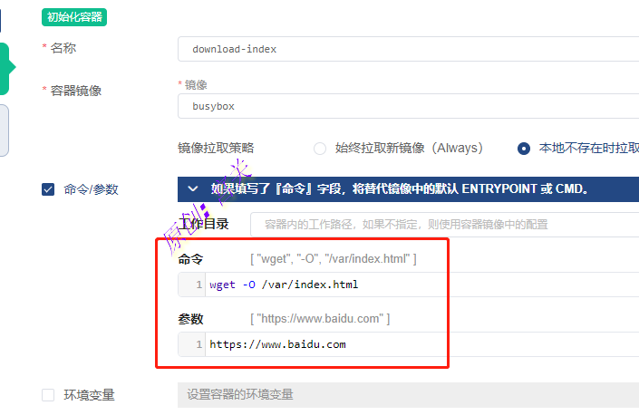 有两个选项,一个是初始化容器,一个是工作容器,初始化容器的作用就是在工作容器运行之前需要执行的某些动作或者命令,下图中表示在工作容器启动之前,先执行初始化容器,下载https://www.baidu.com页面的index.html文件,保存到busybox容器内部的/var目录,如图: